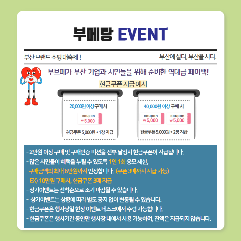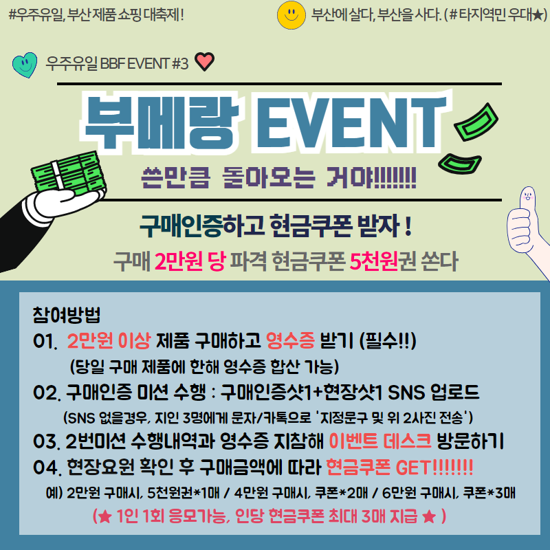 사랑만 돌아오는게 아니야! 부브페에선 현금쿠폰이 돌아온다! #쓴만큼 돌아오는 '부메랑 이벤트' 페이지 정보 작성자 부산브랜드페스타 조회 1,169회 작성일 23-06-23 18:03 본문 목록 이전글2023 참가업체 부스배치도 및 현장리플릿 23.07.01 다음글무더위를 날려버릴 강력한 이벤트가 온다!! #SNS 공유 이벤트 23.06.23